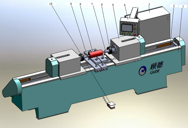 設備由床身、傳動總成、左右機箱、壓裝機具、輥皮支臺、電控箱、觸摸屏操控站、專用程序及附件組成,附加軸定位機構。(若托輥軸端有****眼,此機構不需配置)