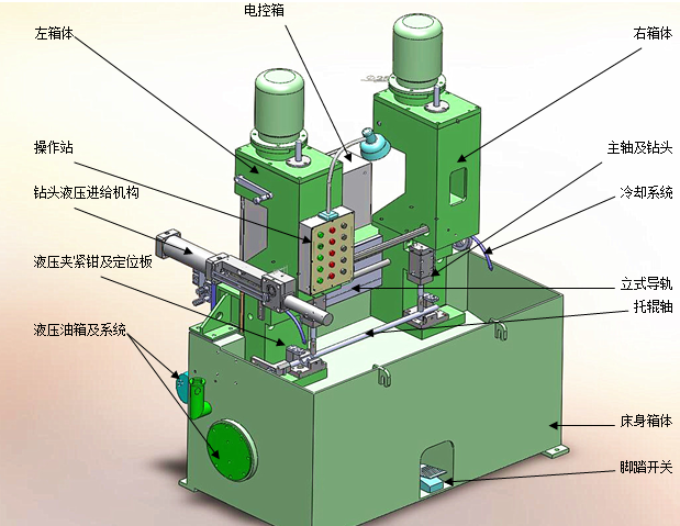 2 組成:由機(jī)電液3大部分組成,主要有:左箱體、右箱體 、床身箱體、鉆頭液壓進(jìn)給機(jī)構(gòu) 、液壓夾緊鉗及定位板、主軸及鉆頭、立式導(dǎo)軌、操作站、電控箱、腳踏開關(guān)、液壓油箱及系統(tǒng)、冷卻系統(tǒng)等。全齒輪傳動(dòng)結(jié)構(gòu)。